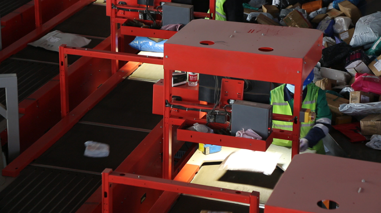 工作人员在自动化分拣设备旁对快递包裹进行扫码核对