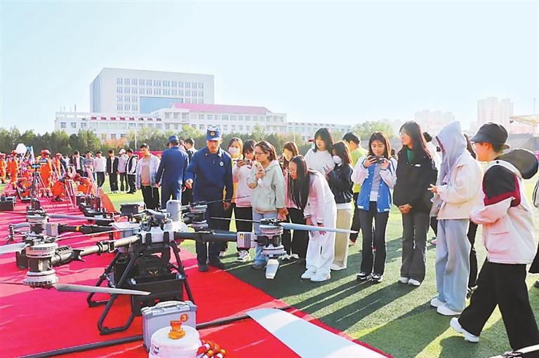 消防救援人员向同学讲解各类器材性能。庆阳市消防救援支队供图