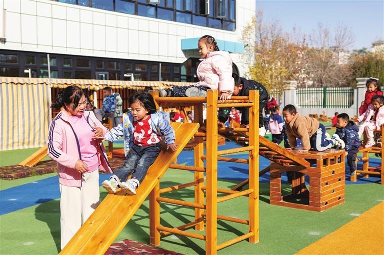 酒泉市敦煌路幼儿园的保育员在陪幼儿做游戏。范昊帆