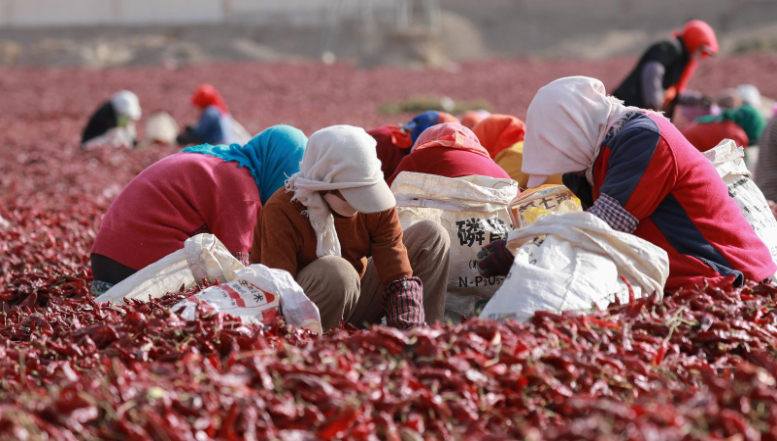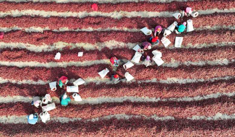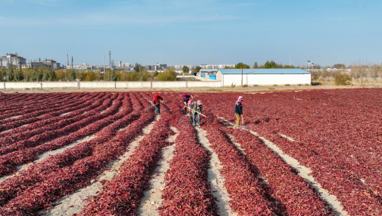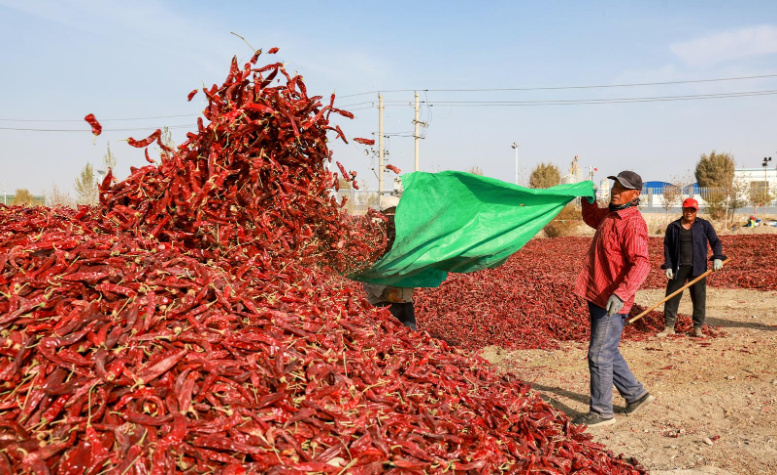 甘肃兴农辣椒产业开发有限公司的辣椒晾晒场上,一车车干辣椒从田间运抵这里,工人们正忙着筛选、分拣、晾晒辣椒,现场繁忙有序,这些火红的辣椒很快就会成为千里之外餐桌上的美味佐料。