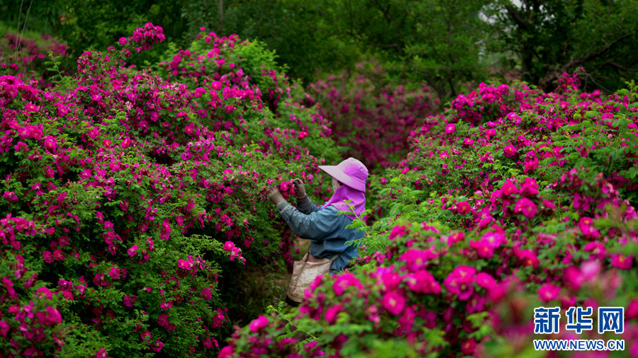 当地人采摘苦水玫瑰(资料图片)。(永登县融媒体中心供图)