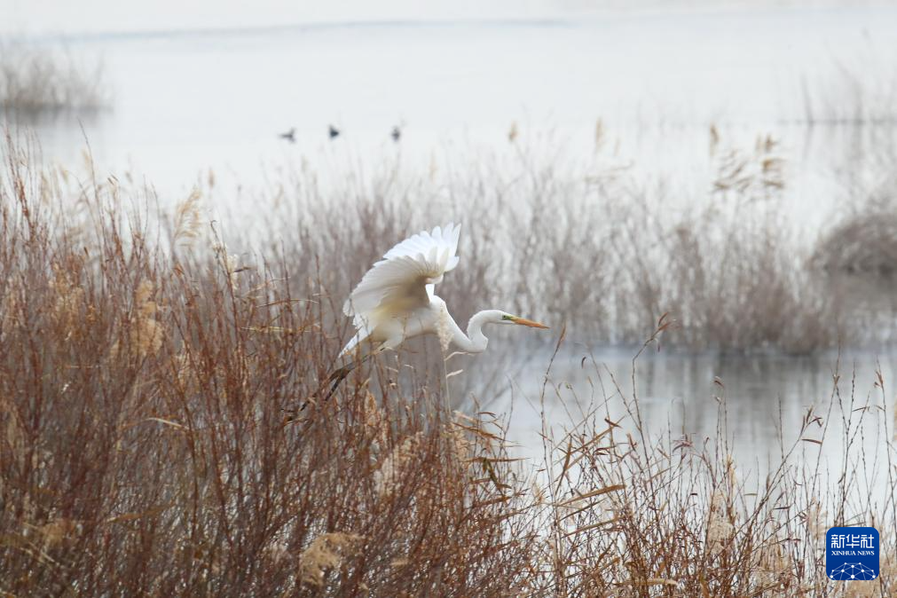 11月22日,在河西走廊东端的甘肃民勤石羊河国家湿地公园,大白鹭在红崖山水库飞翔。新华社记者 张智敏 摄
