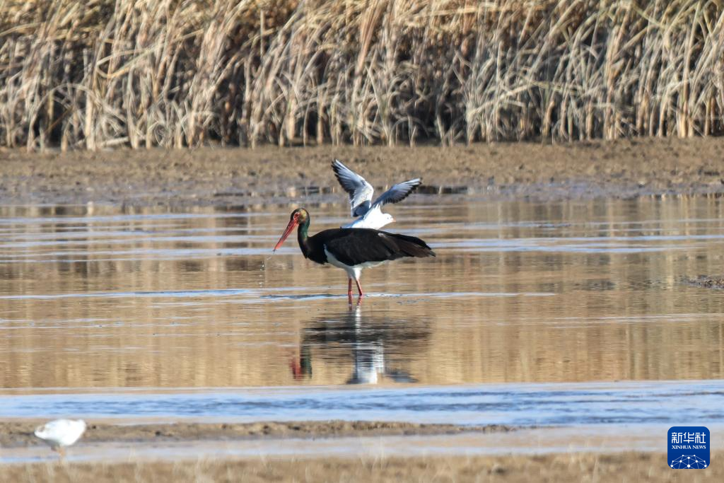11月12日,在河西走廊中部的张掖黑河湿地国家级自然保护区高台段,国家一级保护野生动物黑鹳在一处湿地浅滩觅食。新华社记者 郎兵兵 摄
