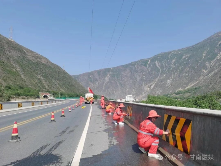 在日常养护中,中心精准编制养护方案,聚焦油路修补、构造物维修、跳车处治等关键环节,实现养护工作精度、深度、广度的全面提升。预防性养护方面,结合甘南高寒阴湿的地域特征,因地制宜采用精表处、微表处、碎石封层等技术,对路面裂缝、构造物破损等隐患早发现、早处置,有效延长公路使用寿命。路域环境整治中,创新“机械冲+人工刷+机械洗”作业模式,定期对标志标牌、波形护栏等设施进行清洗维护,同步清理路面抛洒物、边沟淤积和路肩蒿草,实现“车在路上行,人在画中游”的视觉效果。