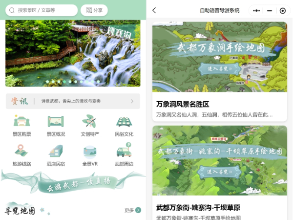 游客不仅可以实时规划路线,还能通过720°VR虚拟游、智能语音讲解、艺术手绘地图等,实现“未到先览、到即畅游”。小程序还接入非接触式票务入园、车船调度等服务,实现线上线下无缝衔接,提升游客沉浸感与便利性。据统计,使用该小程序的游客平均游览时间延长约25%,满意度提升40%以上,真正实现“一部手机,畅游武都”。