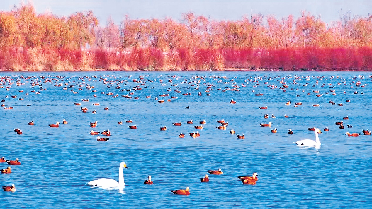每年9月—11月,来自西伯利亚、蒙古高原等地的候鸟沿着东亚-澳大利西亚迁徙路线南迁,这片湿地不仅成为它们漫漫征程中至关重要的“补给站”,更被生态专家亲切地誉为沙漠中的“五星级服务区”。目前该自然保护区内的鸟类超过100种,数量超过3万只。