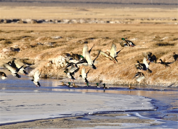 玉门赤金峡,黑鹳翩跹而至;金塔黑河边,天鹅翩然游弋;甘肃盐池湾国家级自然保护区,绿头鸭破冰嬉戏……