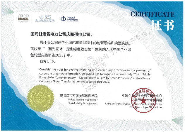 近日,《联合国气候变化框架公约》第三十次缔约大会(以下简称“COP30”)中国角“低碳技术创新与产业实践”主题边会在巴西帕拉州首府贝伦市顺利召开。该边会由生态环境部应对气候变化司指导,中国环境科学研究院、生态环境部环境发展中心、中国工业经济联合会、中国产业发展促进会联合主办,《中国企业绿色转型实践报告2025》在边会上发布,国网庆阳供电公司《“菌光互补”探出绿色致富路》实践案例被成功收录于《报告》中,成为能源企业助力乡村振兴与绿色转型的典型范本。