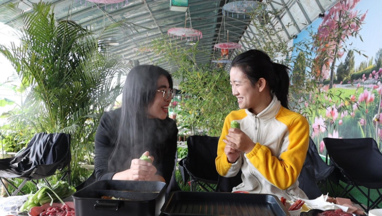 游客正在大棚内品尝绿色健康的果蔬和火锅