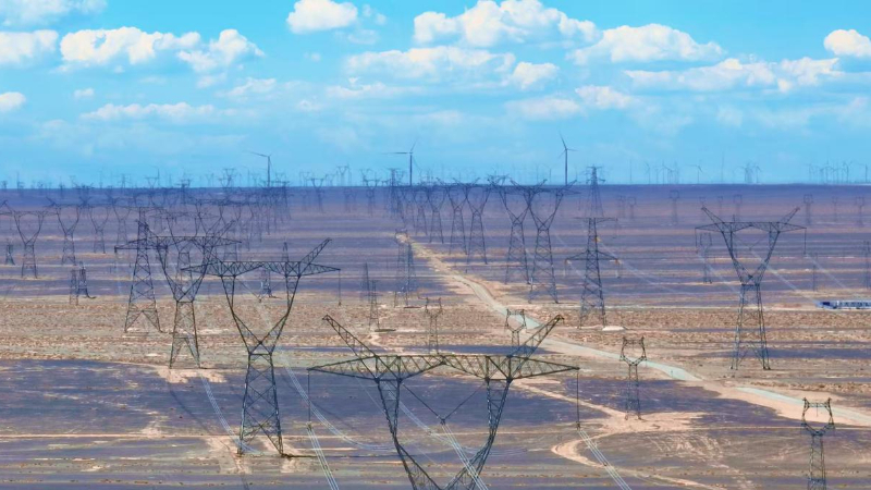 在甘肃酒泉戈壁上的±800千伏祁韶特高压直流输电工程。张晨 摄