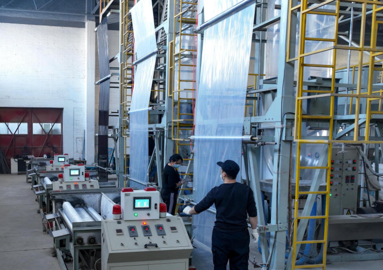 在金塔县民富地膜厂的地膜生产车间里,3条吹塑生产线高速运转,机器轰鸣声此起彼伏。8米高的吹膜口处,优质农用薄膜如白色瀑布般“喷涌”而出,自上而下均匀缠绕在卷筒上;工人们娴熟穿梭,收卷、称重、包装等工序衔接流畅,一卷卷检验合格的地膜被整齐码放成垛,静待发往田间地头。