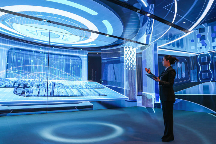 1月6日,在全国一体化算力网络国家枢纽节点(甘肃)庆阳数据中心集群展示中心,工作人员介绍“东数西算”工程规划及建设推进情况。新华社记者 郎兵兵 摄