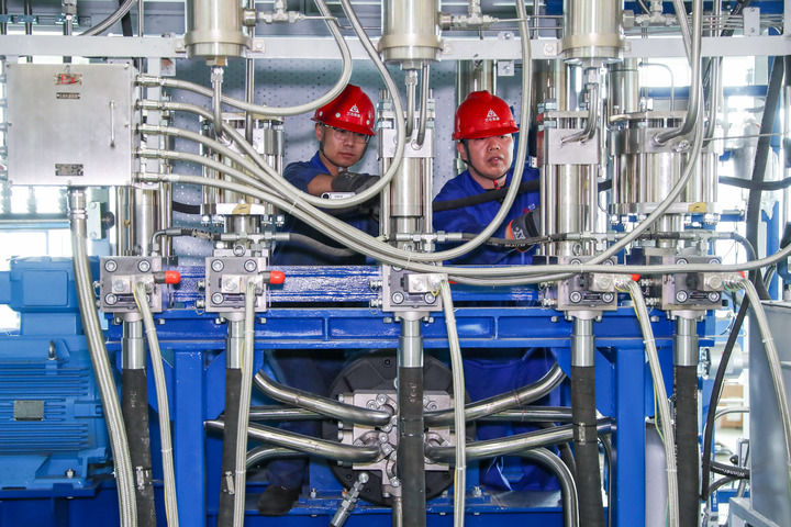 8月6日,在位于兰州新区的兰州兰石集团有限公司装备公司生产车间,工作人员正在对承制的90MPa离子液氢气压缩机做测试前的准备工作。新华社记者 郎兵兵 摄