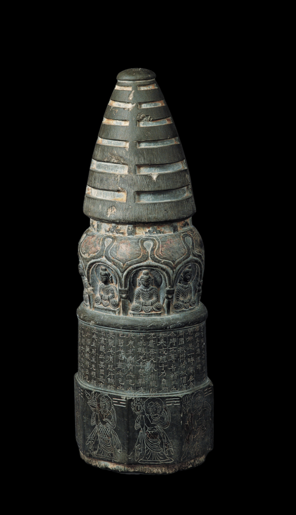 高善穆石造像塔(北凉),于酒泉市石佛湾子出土,塔高44.6厘米,底径15.2厘米。黑色砂页岩质,基座已佚。基座之上为八面形的塔基,刻出供养菩萨八身,七身立式,一身端坐莲台,各像左侧上角刻八卦符号。塔基上为圆柱覆钵形塔身,上刻隶书发愿文与经文36行,内容是《增一阿含经·结禁果》中的一段,纪年为承玄元年(428年)。上顶瓶形覆钵,覆钵开八个圆形龛,七个龛内刻禅定坐佛,一龛内雕交脚弥勒。覆钵之上有七重相轮,顶端宝盖象征天穹,阴刻北斗七星。