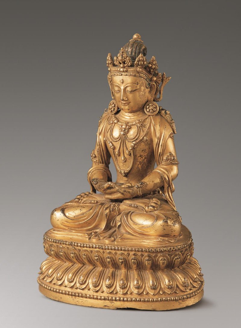 永乐款鎏金菩萨坐像(明代),高20.3厘米。此像头戴花冠及发髻冠,菩萨面部广额丰颐,双目微垂,面容慈祥。身披帛巾,胸部前饰缨珞,衣纹弧线流畅优美,下裙宽大贴体,结跏跌坐于深束腰仰覆莲台座上。莲台座底下阴刻“大明永乐年施”铭文。