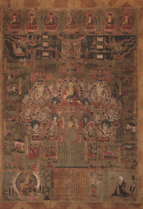 《报父母恩重经变》图轴(北宋),出土于敦煌莫高窟藏经洞,画面高182厘米,宽127厘米。画中心绘阿弥陀佛及观世音、大势至二菩萨并坐说法,上部绘“七佛”、“七宝”及仙山楼阁等。下部有十弟子、十二菩萨分列两侧供养。图轴绢地、敷彩,绘佛、菩萨和僧俗人众等110多人,人物形象生动自然。经变故事分列在说法图两侧,以经变画常用的连环画的形式展开,一个情节一幅画,共有15幅。它们各自独立,相互之间用山石分隔,每幅画的右侧或左侧都有墨书题榜,说明所画内容。是国内现存的幅面较大且有纪年的一帧绢本佛教故事画。