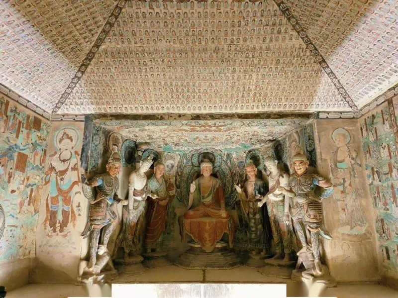莫高窟第45窟彩窟群,盛唐时期彩塑的巅峰之作,七身塑像(一佛,二弟子,二菩萨,二天王)姿态,神情各异,被誉为举世无双的彩塑博物馆。