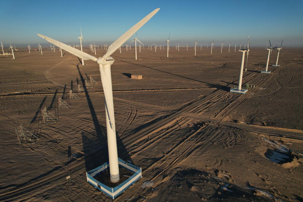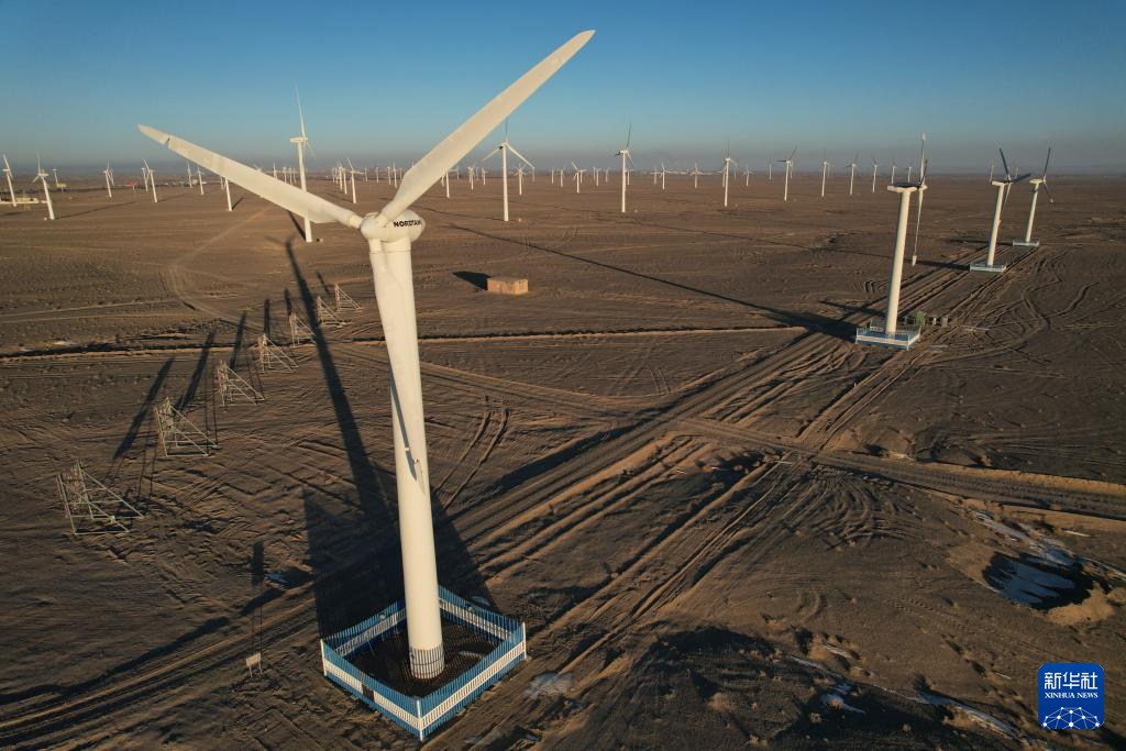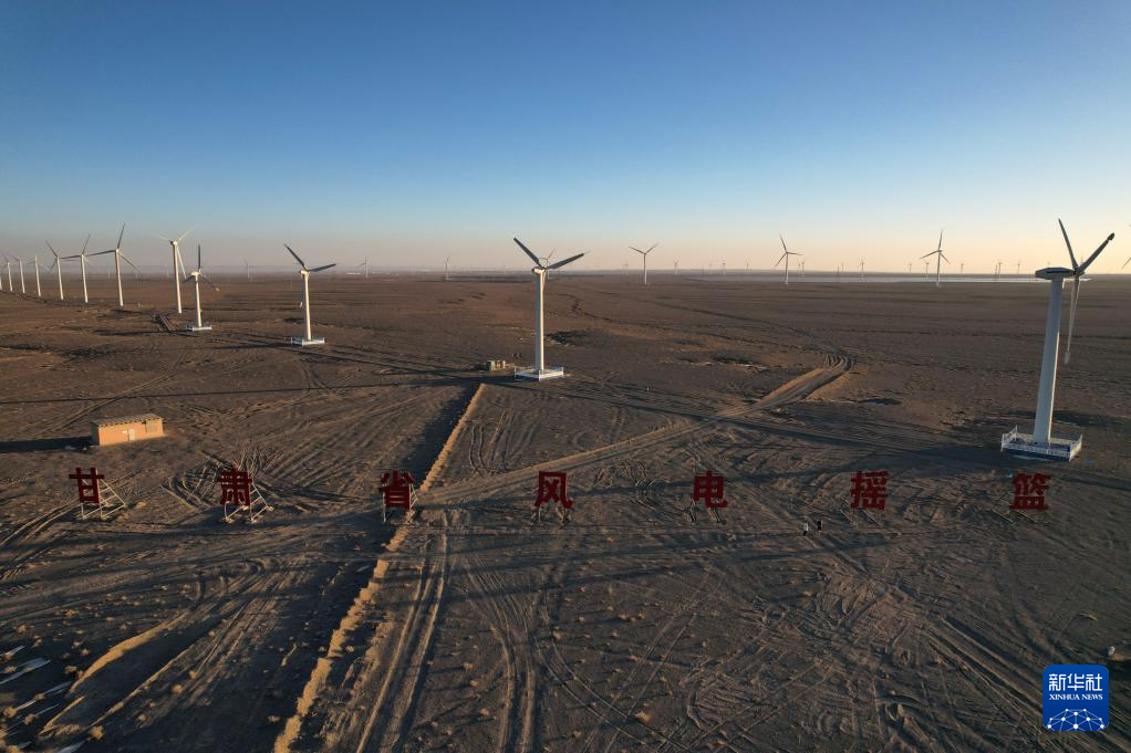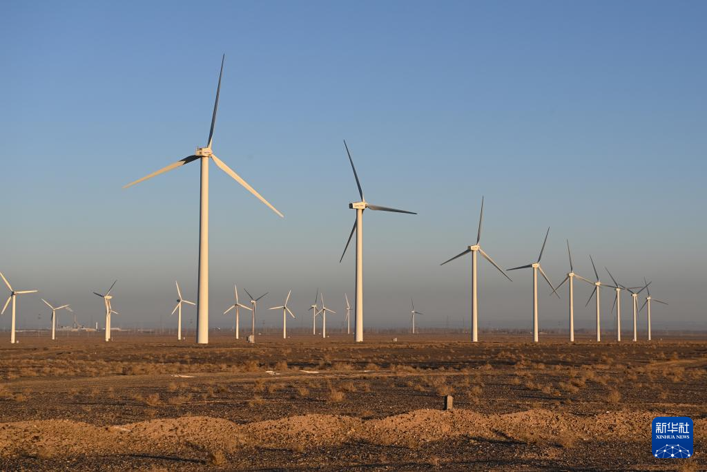 这是12月2日在甘肃省玉门市拍摄的戈壁滩上的风电机组。新华社记者 范培珅 摄