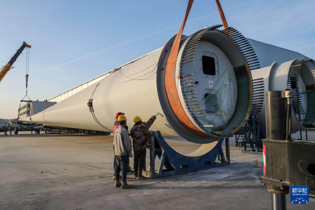 11月20日,在甘肃省酒泉经济技术开发区的甘肃九鼎风电复合材料有限公司,工作人员进行风机叶片轮毂试装作业。新华社记者 郎兵兵 摄