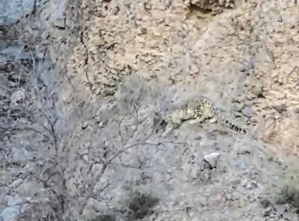 此次拍摄到的雪豹体形健硕,毛色灰白相间,黑色斑纹清晰可见。画面中,雪豹步态从容,穿行于坡地、岩石间,时而驻足望向拍摄者的方向,后进入一处碎石嶙峋的河谷,离开拍摄者视线。