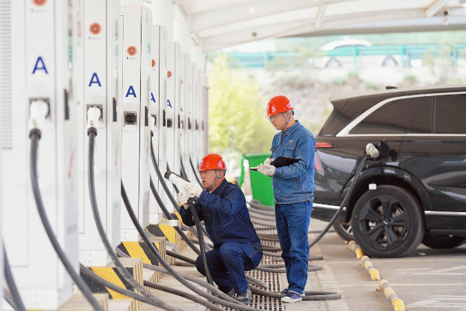 国网兰州供电公司员工巡检兰州北服务区电动汽车充电站,服务新能源车主出行。史双绚摄