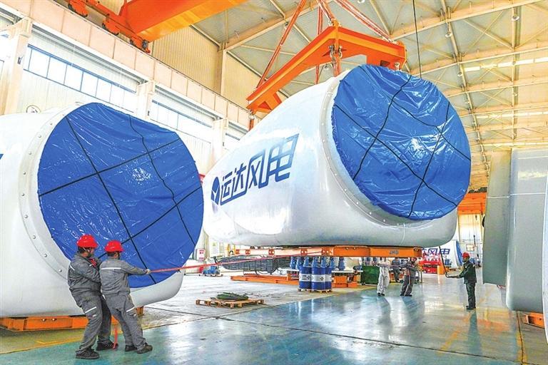 甘肃省云风智慧风电设备有限公司(运达股份西北总部)工人准备将风电主机装车。谢沛宏