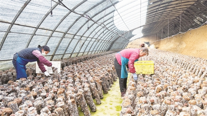 图为务工人员正在采摘香菇。