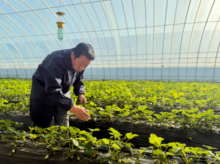 据张帆介绍,温室顶部的太阳能装置可以源源不断地输送热量,两侧的水幕墙在智能控制系统调控下自动保湿降温,地面铺设的小雨滴灌系统可以实现精准滴灌。“我们通过滴灌系统精准供水,既节水又能保证养分均衡。”张帆指着监控平台说,“温室里的温度、湿度、土壤墒情都能实时监测,夜间通过水幕墙和管道控温系统进行保温,不用人工值守就能保障草莓生长。”谈及日常管理,张帆坦言:“现在主要就是清理废叶、监测数据,智能系统帮我们省了不少力,种出来的草莓口感和品质都有保障。”