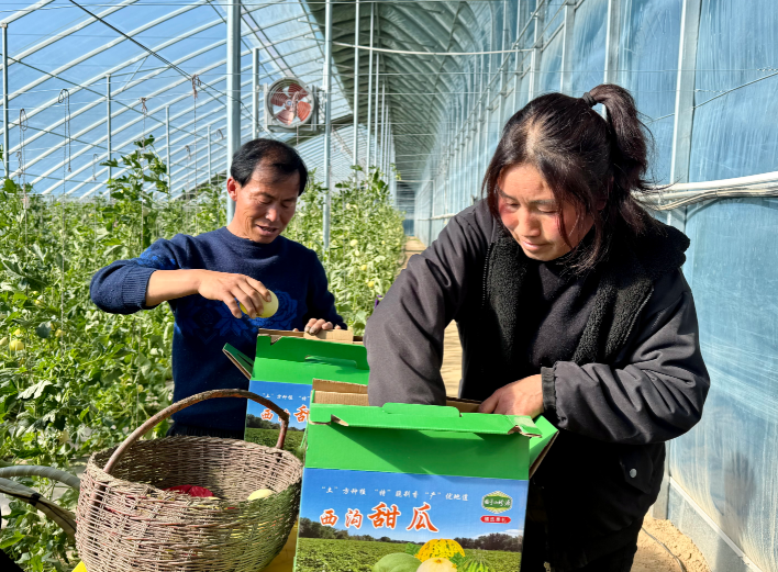 隆冬时节,环县大地寒意正浓,而温室大棚内却暖意融融、生机盎然。在曲子镇西沟村的日光温室里,翠绿的甜瓜藤蔓爬满支架,负责人刘军军正和同事们穿梭其间,小心翼翼地采摘着刚成熟的甜瓜,果香在温润的空气中弥漫开来。
