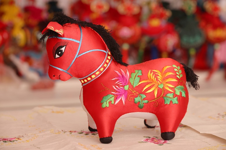 “这款是刚做好的‘寿马迎春’香包摆件,造型很饱满,全身红彤彤的,看着就喜庆富态!马身上还绣了菊花纹样,菊花代表长寿安康,搭配这吉祥的红马,传递出富贵长寿、迎春纳福的美好寓意……”赵丽珺边展示各种款式的香包,边告诉记者,每年端午、春节是香包销售旺季,最近马元素香包、十二生肖挂件等比较受欢迎。