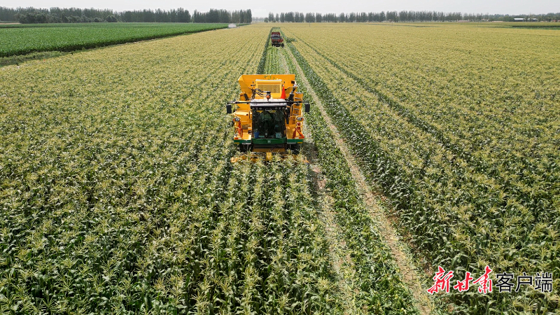 甘肃农垦黄羊河农场甜糯玉米机械化采收。