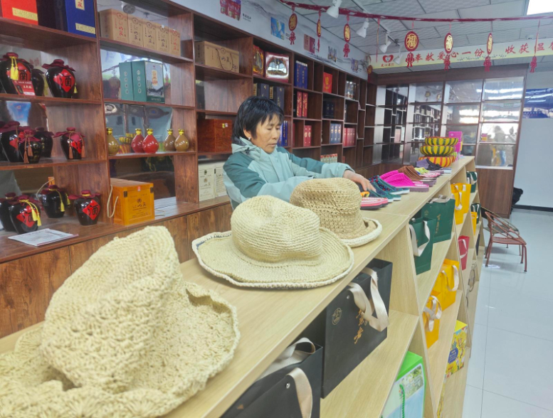 周元花仔细摆放自己亲手编织的手工艺品