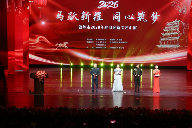 12月29日晚,由敦煌市干部职工全程参演的“辞旧迎新·同心筑梦”2026年庆元旦文艺演出活动在敦煌大剧院举办,演出现场坐无虚席,精彩节目引得观众连连拍手称赞,为新一年的发展奏响了奋进序曲。(张文瑾)