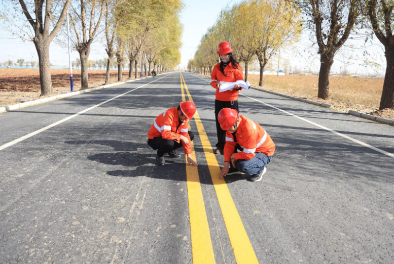永昌县交通运输局公路段工作人员在永清路检查完工的黄色标线施工质量情况