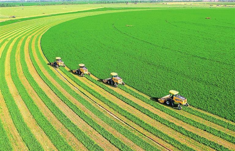 武威市万亩节水优质苜蓿种植基地紫花苜蓿收割现场。