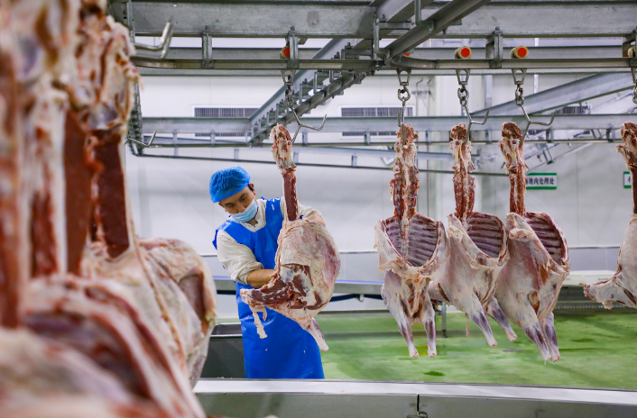 环县中盛羊业发展有限公司的生产车间里,机器转个不停,工人们来回穿梭,忙而有序。去骨、分切、修整、分级,一道跟着一道干,工人们盯着手里的羊肉,顺着肉的纹理仔细下刀,把整羊分成肋排、羊腿、羊腩、里脊等多个部位,分好类的羊肉摆得整整齐齐,样样齐全。包装车间里,工人们各干各的活,分拣、称重、打包一气呵成,一块块羊肉装好特色包装,好看又有品质。仓库那边,物流师傅们有条不紊地把打包好的羊肉搬上车,一车车发往全国各地。