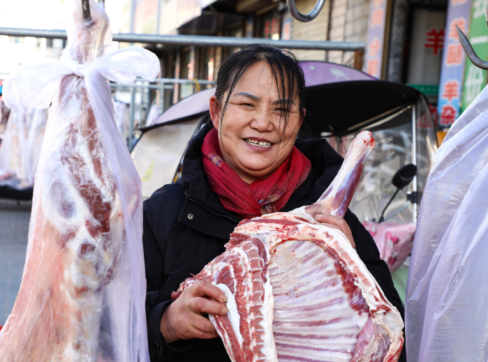 十几家羊肉店前,一排排羊肉胴体挂得整整齐齐,色泽鲜亮诱人。商户们个个忙得脚不沾地,有的忙着招呼驻足挑拣的本地顾客;有的手脚麻利地给顾客称重、分割,刀起刀落干净利索;还有的专给外地预订的客户打包,仔细核对着订单信息,市场里收款提示音、吆喝声、切肉声混在一块儿,满是烟火气。