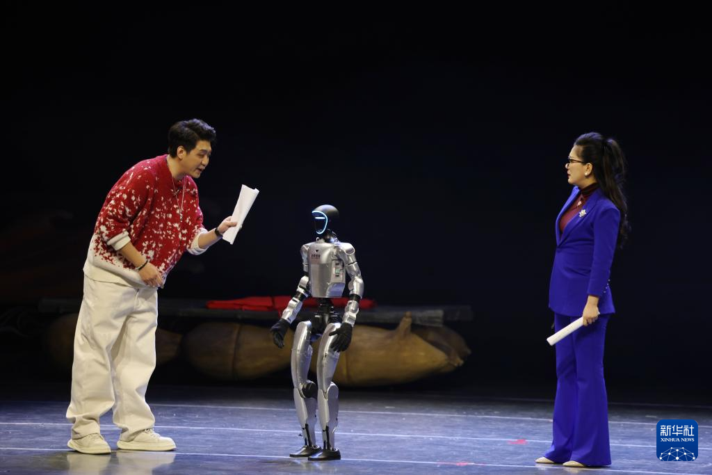 主持人在甘肃省群众文艺展演展播活动首场演出中和机器人互动(1月7日摄)。新华社记者 陈斌 摄