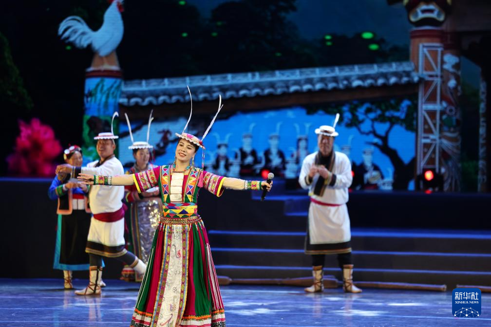 甘肃省陇南市文县白马人民俗文化艺术团的演员在甘肃省群众文艺展演展播活动首场演出中表演歌舞(1月7日摄)。新华社记者 陈斌 摄
