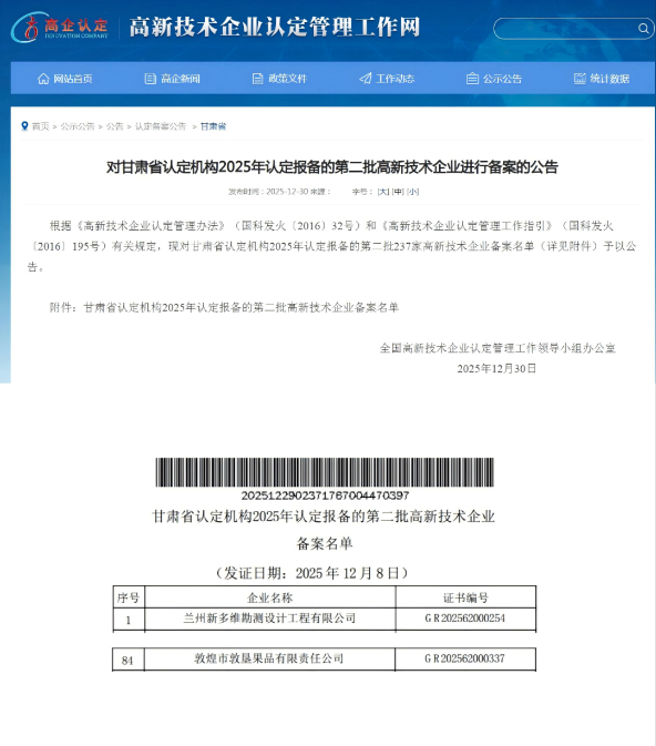 近日,全国高新技术企业认定备案发布,亚盛好食邦敦垦果品公司顺利通过省级高新技术企业资格复审。