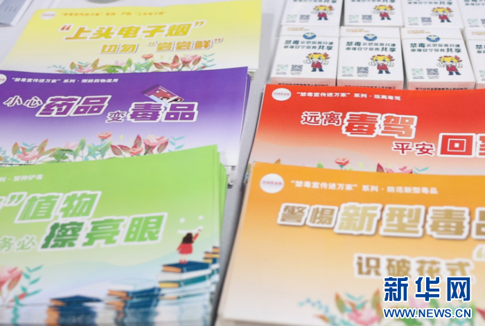 110宣传咨询区的禁毒宣传册。新华网发(童张伟 摄)