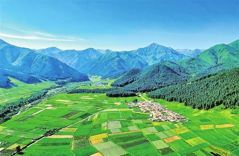 天祝县哈溪镇大尖山沟,林区、村庄、农田构成美丽画卷。