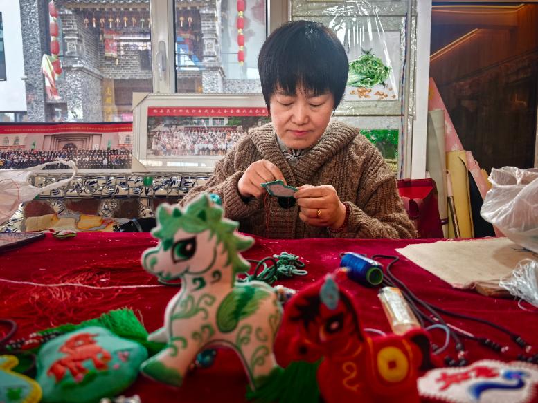 艺术馆南侧,气氛静谧而专注。刺绣非遗传承人曹伟伟指尖捏着细针,彩线在她的牵引下,在红色锦缎上翩跹起舞。她正在缝制一个精致的福袋香包,一面是栩栩如生的刺绣奔马,昂首奋蹄;另一面,却是一个用丝线绣成的古朴苍劲的甲骨文“马”字。