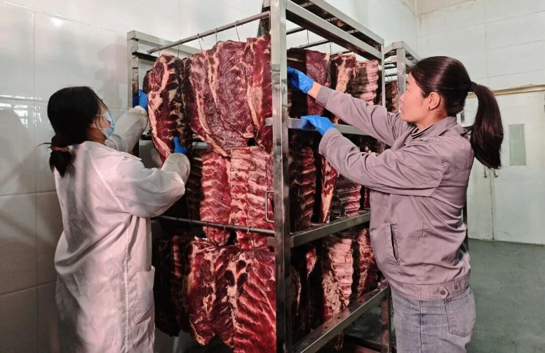 养殖端蓬勃发展的同时,产业链下游的加工环节也在同步增效。在舟曲县绿脉农业科技有限责任公司的生产车间内,经过严格筛选的黑猪肉,正被加工成风味独特的腊味产品。工人们熟练地修整、腌制,再将肉条送入智能烘干房,恒温慢烘,锁住传统风味。“我们黑土猪腊肉选用养殖10个月以上的本土黑土猪,肥瘦相间。在传统工艺的基础上,今年改进了加工工艺,采用低盐微烟熏制,既保留了传统风味,又优化了口感。我们通过线上线下同步销售,去年销售额达1300多万元,不仅让舟曲腊味走向全国市场,也带动当地专业合作社与养殖户稳定增收,走出一条产业助农的新路子。”公司市场销售负责人刘婷风说。