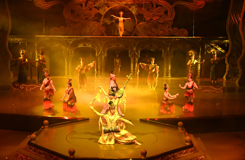 大型洞窟式沉浸体验剧《乐动敦煌》溯源敦煌文化,借助对莫高窟壁画、藏经洞古籍的深度解读梳理,活化敦煌古乐器、古乐谱研发成果,采用全息投影、3D威亚等高科技手段,以全沉浸式的呈现方式,演绎了西域少年白氏追寻艺术的动人故事。