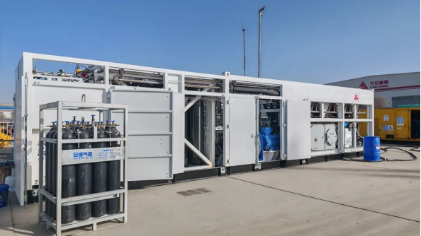 该设备是兰石集团基于自主研制的90MPa离子液氢气压缩机,创新研制的“移动式橇装加氢站”(MHRS),可实现整体移动运输,相比传统加氢站,具有结构紧凑、运输便捷、使用成本低、维护简单等显著优势。