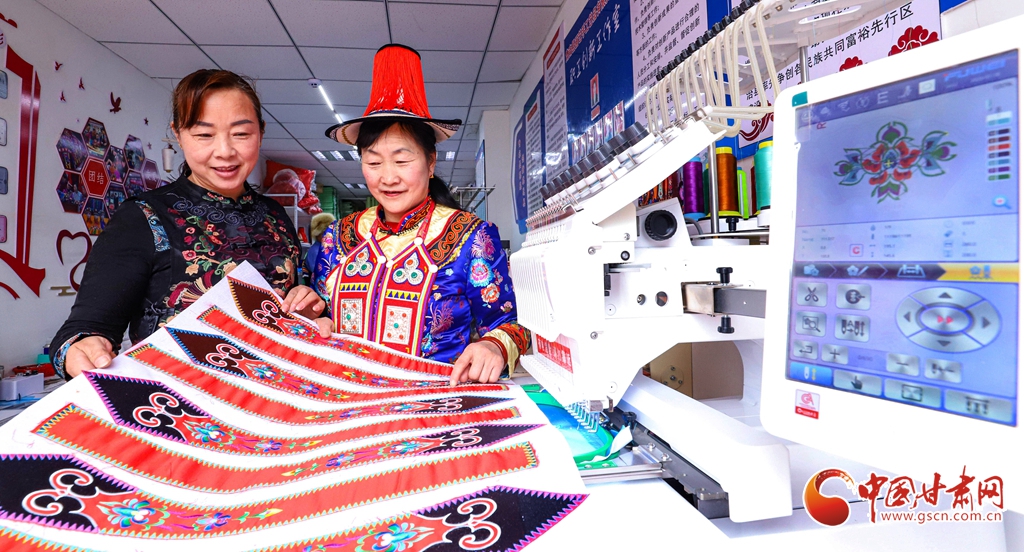 1月18日,祁连山下寒风凛冽,张掖市肃南裕固族自治县的非遗传承技艺大师工作室内却气氛热烈。非遗传承技师潘小红和杨海燕正带领民族服饰爱好者,学习数字全自动刺绣、数字印花、全自动烫金、数字智能缝纫、数字包边、裁切及AI智能图案设计等民族服装智能化制作技艺。