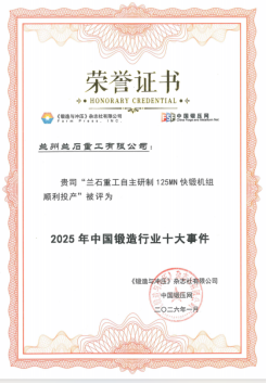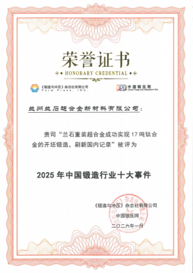 近日,“2025年中国锻造行业十大事件”评选结果公布,兰石重装重工公司“自主研制125MN快锻机组顺利投产”,兰石重装超合金公司“成功实现17吨钛合金的开坯锻造,刷新国内纪录”同时入选2025年中国锻造行业十大事件。