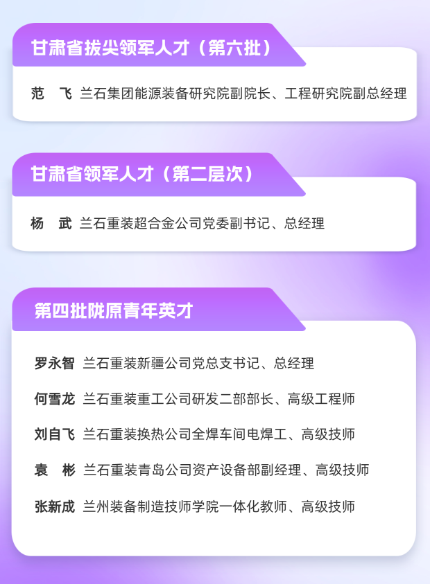 兰石集团1人入选第六批甘肃省拔尖领军人才、1人入选2025年甘肃省领军人才、5人入选第四批陇原青年英才,彰显了集团在强化高层次人才队伍建设方面取得的显著成效。