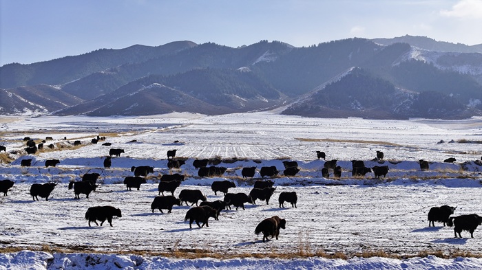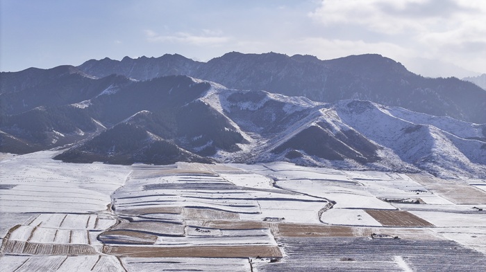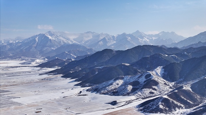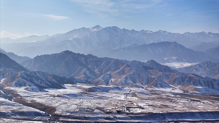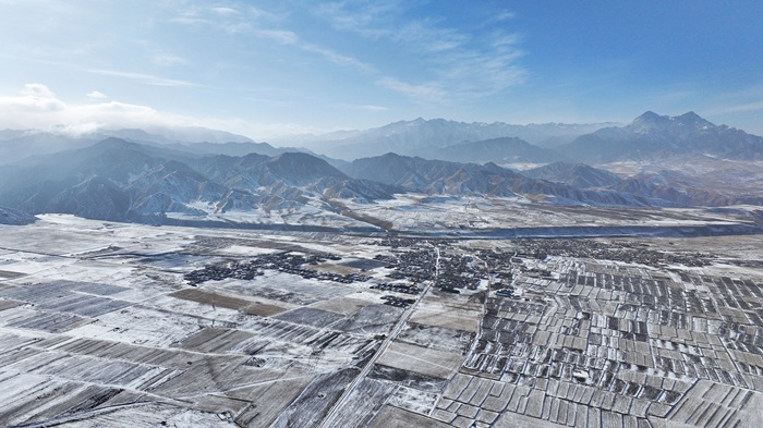 近日,一场初雪过后,在甘肃省张掖市民乐县境内,连绵起伏的祁连山脉被皑皑白雪覆盖,层峦叠嶂宛如朵朵“浪花”。山脚下,田野与村庄错落分布,牛羊在覆雪的田地上悠然觅食,一幅雄浑壮美的水墨画卷在天地间铺展开来。(王晓泾)